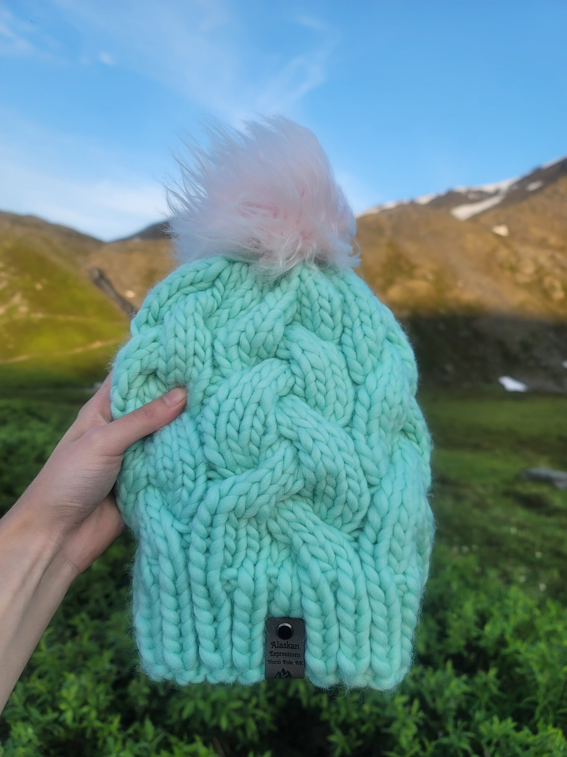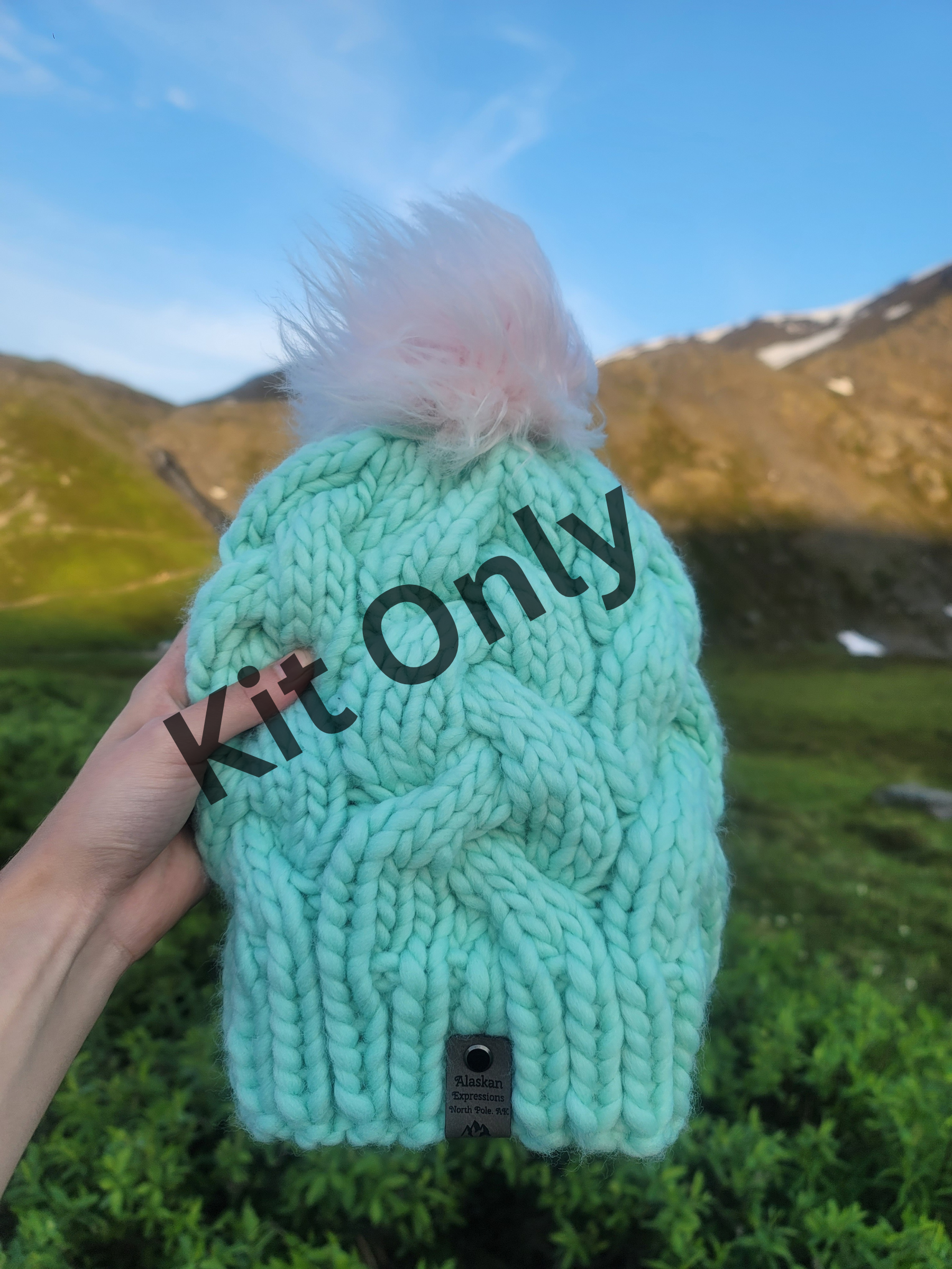 This is not a finished product. This is a project kit to make item pictured. This project kit includes yarn, pom-pom, and pattern to make the Alaskan Cables hat using Malabrigo Rasta merino wool yarn.