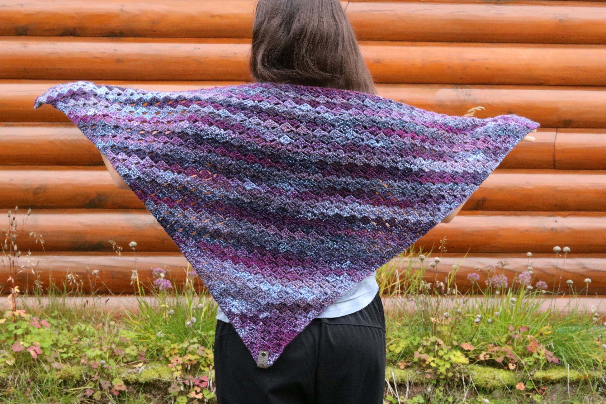 This beautiful triangle shawl features a soft ombre blend of blue and purple. Made with acrylic yarn, it's perfect for adding a pop of color and warmth to any outfit.