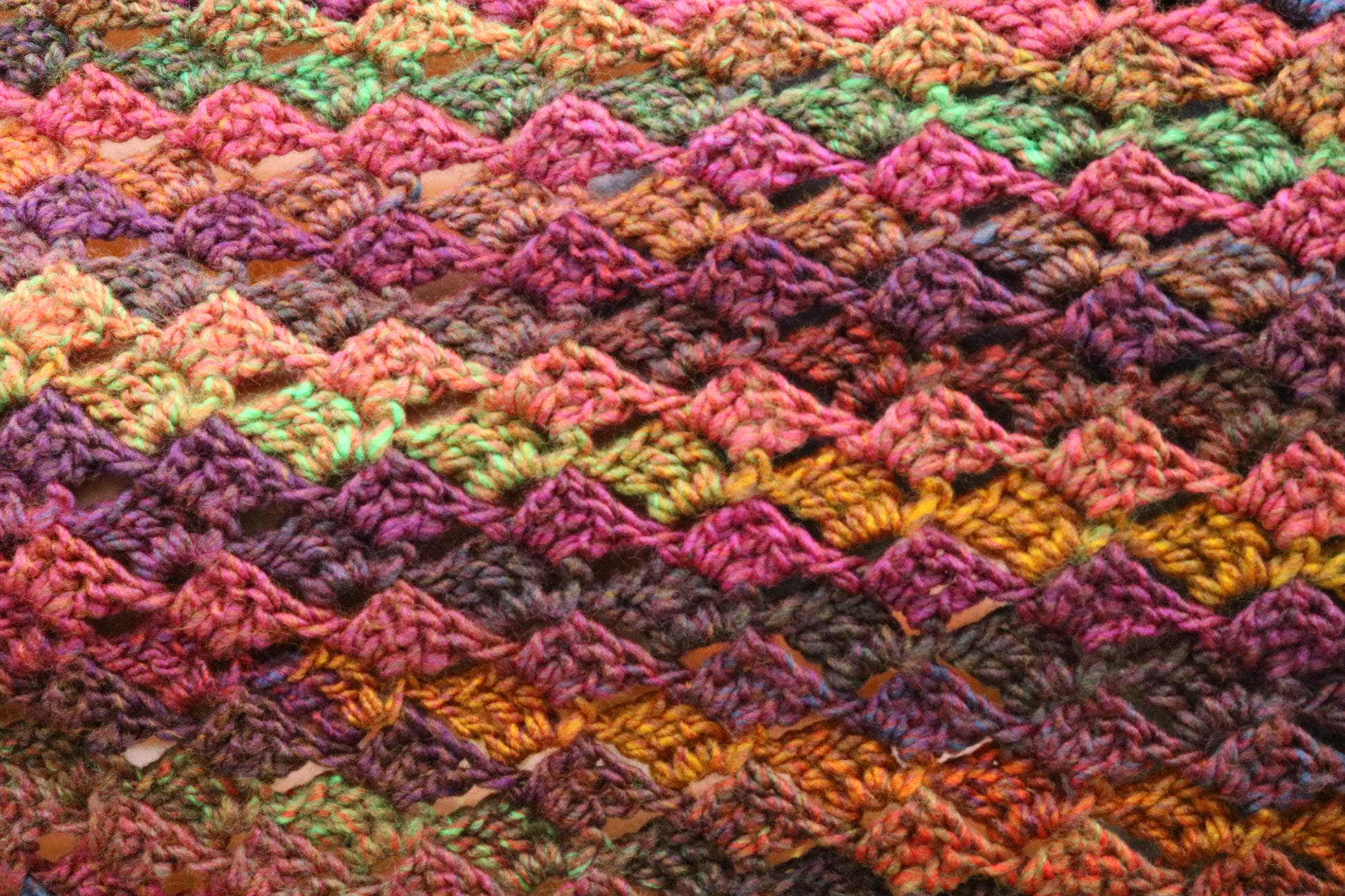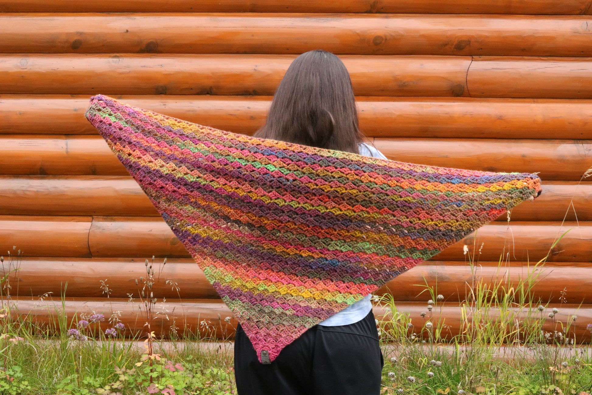 This cozy crochet shawl features a beautiful corner-to-corner design in warm Alaskan fall colors. Made with soft acrylic yarn, it's perfect for adding both color and warmth to your wardrobe.