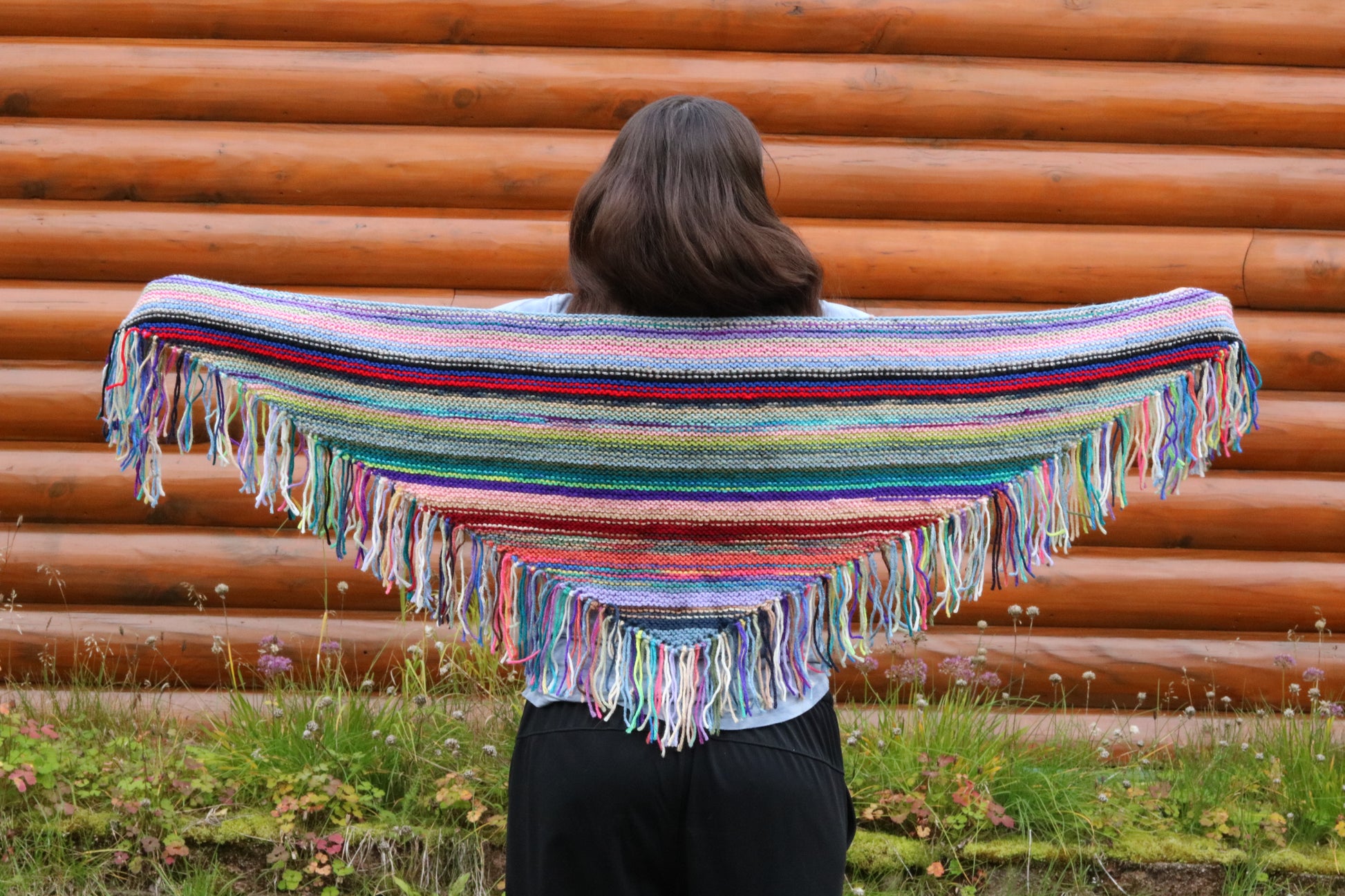 This cozy, knitted triangle shawl is made from soft acrylic scrap yarn in a mix of colors, giving it a unique, colorful look. The shawl features fringes on the edges and can also be worn as a scarf.