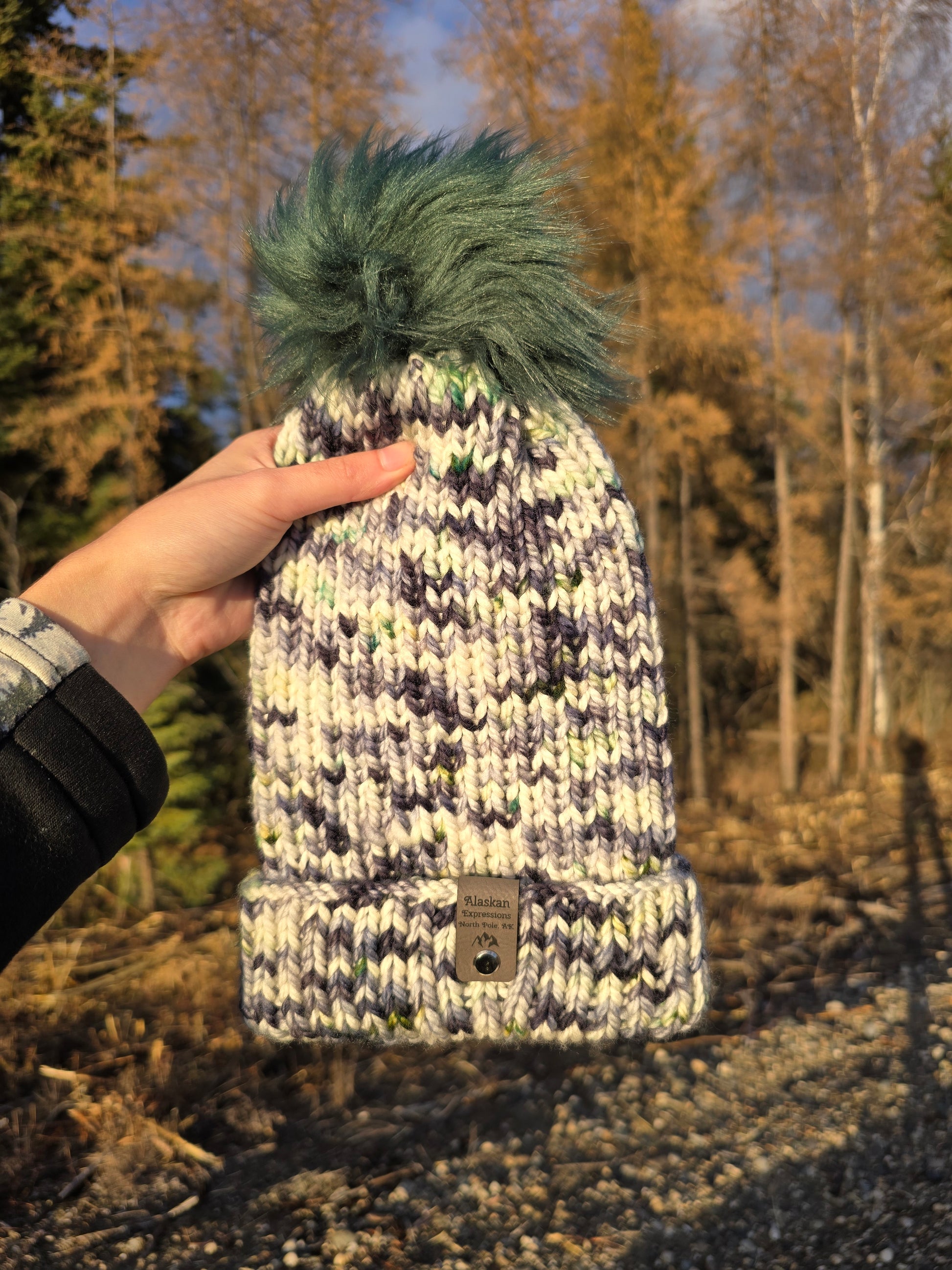 Each hat is hand knit by me in North Pole, Alaska. I hope it keeps you warm on your Alaskan sized adventures!