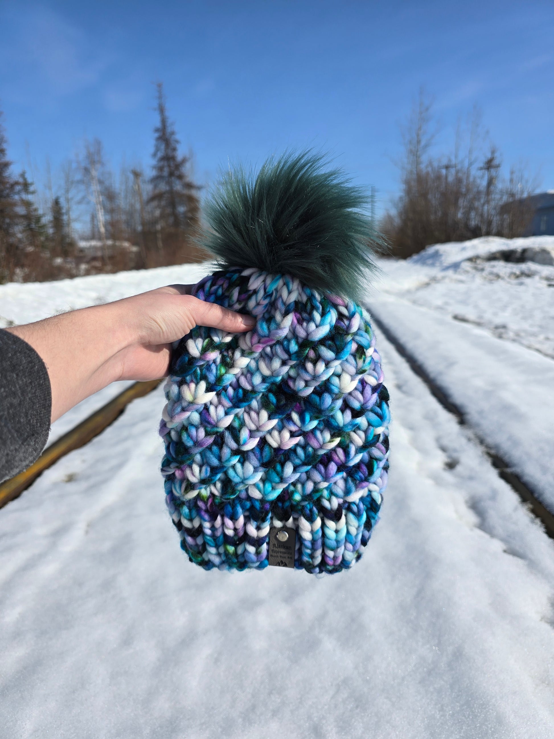 Stay cozy and stylish with our handcrafted merino wool crush hat, featuring hand dyed yarn from Dancing Skies Fiber Arts in Wasilla, AK. The removable pom pom adds the flexibility to wear it with or without, depending on your mood or style for the day!