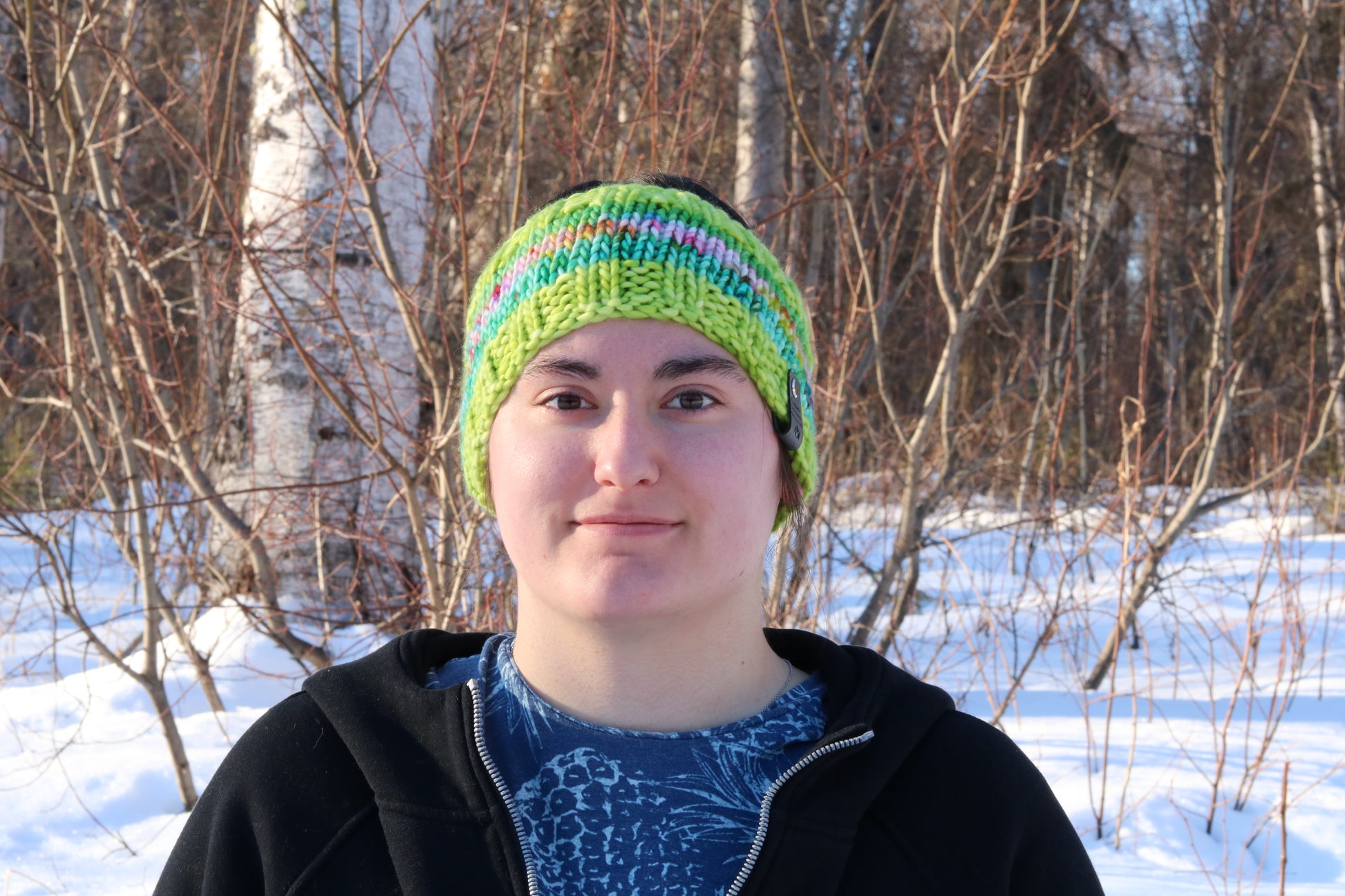 Add a splash of color and warmth with this green and blue headband, crafted from hand-dyed merino wool by Dancing Skies Fiber Arts in Wasilla, Alaska.